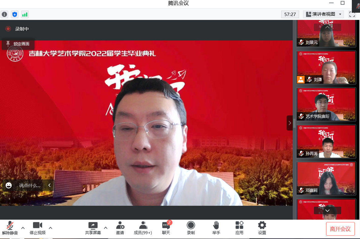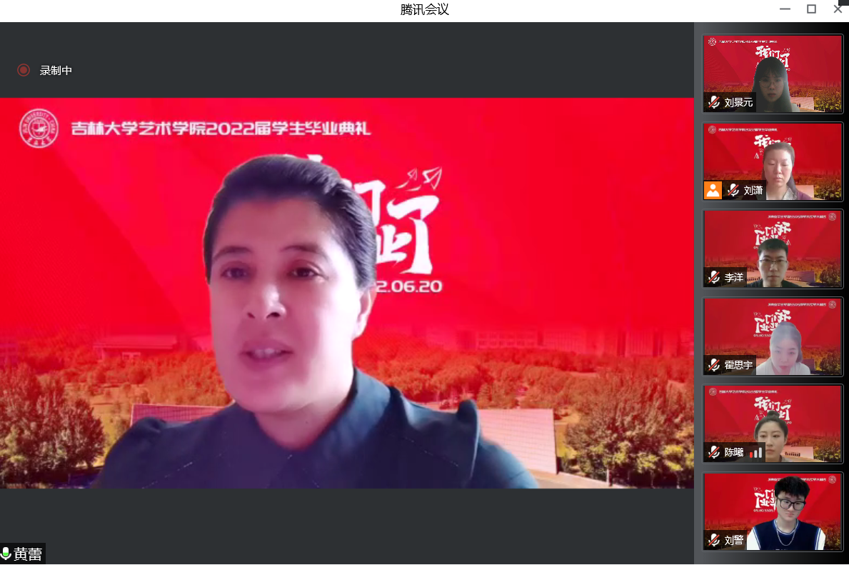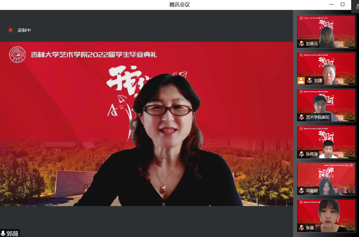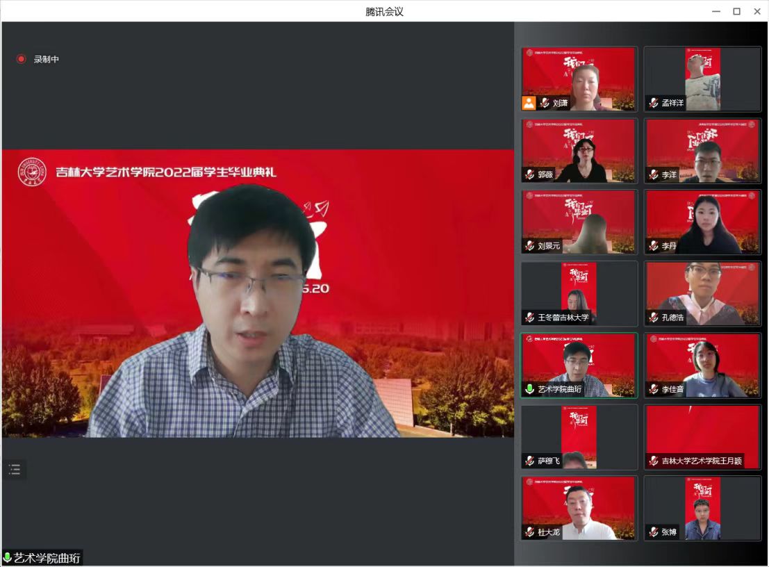 beats365经理郭春方教授致词。他以《文以载道艺以弘德》为题,从三个方面与毕业学子分享关于艺术与人生追求的思考,作为母校为同学们准备的最后一份“毕业礼物”。一是文艺创作,要为时代放歌。文艺是时代前进的号角,文艺创作只有植根现实生活、紧跟时代潮流,才能真正做到思想精深、艺术精湛、制作精良。疫情暴发以来,全院师生创作了系列以抗击疫情为主题的优秀作品,讲述着我们身边的抗疫故事。文艺最能代表一个时代的风貌,也最能引领一个时代的风气。在以“艺”抗疫的征途上奋勇向前,在前所未有的困境中携手前行,共同感受着党和国家在抗击灾难时所爆发出的巨大能量,力尽所能地肩负起吉大人的使命与担当。二是文艺创作,要扎根祖国大地。当代的中国文艺,是包含艺术哲学与精神内涵的时代产物,是反映中华民族精神面貌与审美趣味的文化沉淀,是能够服务于国家需求并引领结构创新的艺术符码。需要在复杂的时代价值环境中,注重全球共识性与民族个性的融通,注重中国语境与国家文明的坚守。扎根祖国大地,发出中国声音,讲述中国故事,扩大“中国艺术”的影响力,是每一名文艺工作者义不容辞的使命与责任。三是文艺创作,要回应民之关切。“中国艺术的生命精神,就是一种以生命为本体,为最高真实的精神”。艺术的真实来源于生活,并对其进行提炼和萃取。文艺工作者的世界观决定了创作过程中的立场、态度和情感。修辞立其诚,艺术之路上,思想的高度、文化的传承、科技的创新,都离不开以人民为中心的创作导向。正如七十六载来,吉大以毫不利己、专门利人的白求恩精神;以一路向北、扎根东北的“北上精神”;以心有大我、至诚报国的黄大年精神,为国家的发展、民族的振兴、社会的进步作出了巨大的贡献。