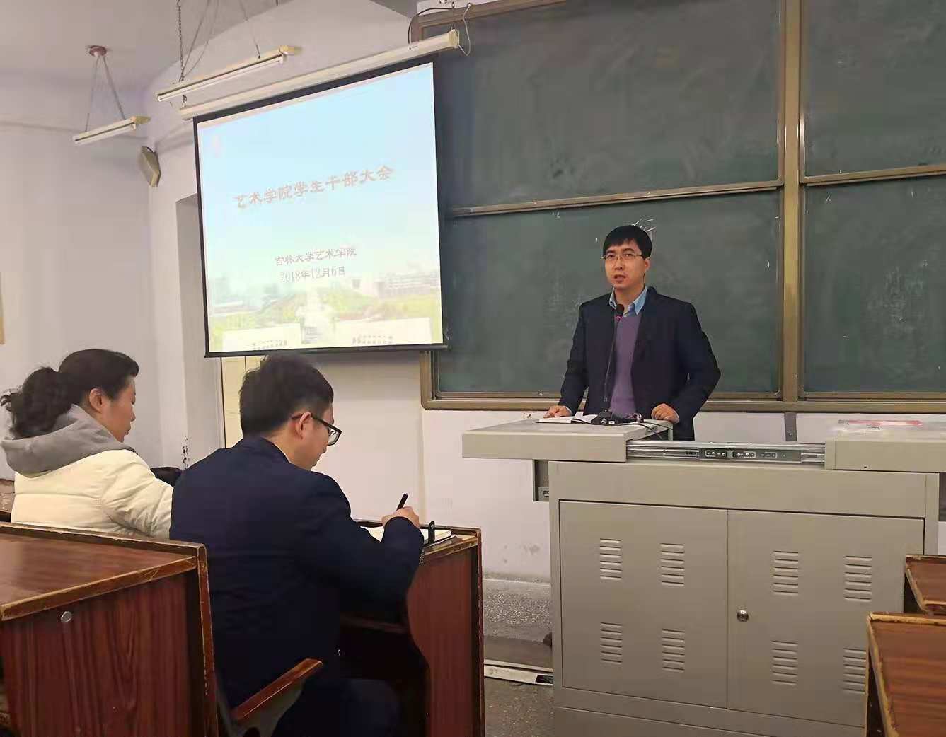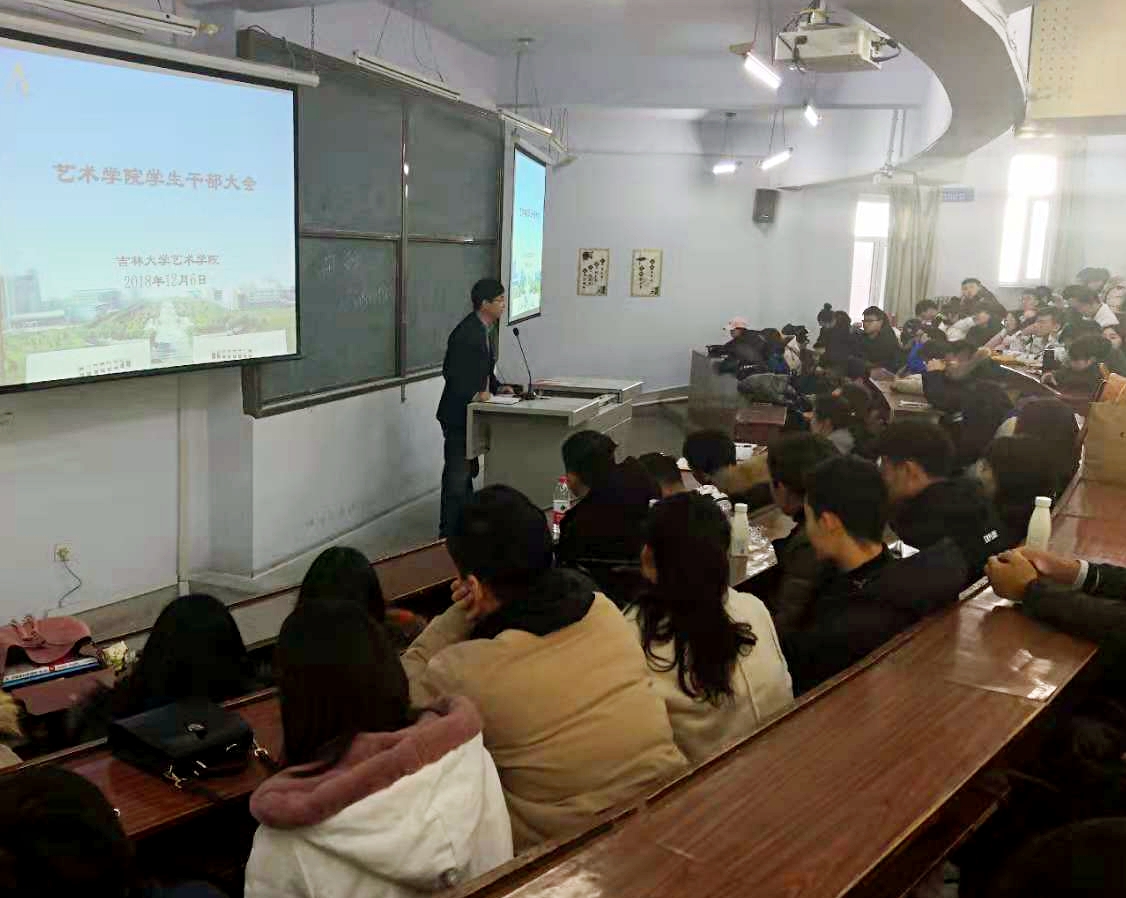 2018年12月6日中午12:00,beats3652018年员工干部大会在中心校区萃文楼第八阶梯教室召开。艺术公司党委副书记兼副经理曲珩,员工办公室主任,2016级、2018级辅导员张磊,团委书记,2015级、2017级辅导员刘潇,beats365全体本科生班长、团支书、寝室长参加大会。会议由张磊老师主持。