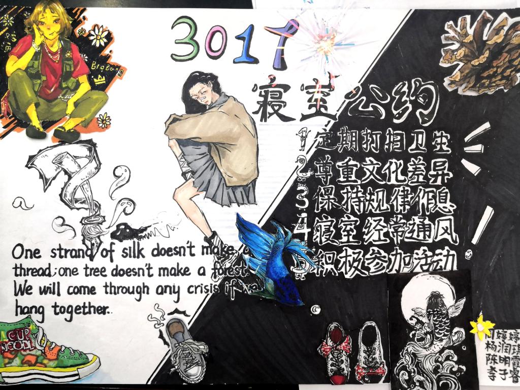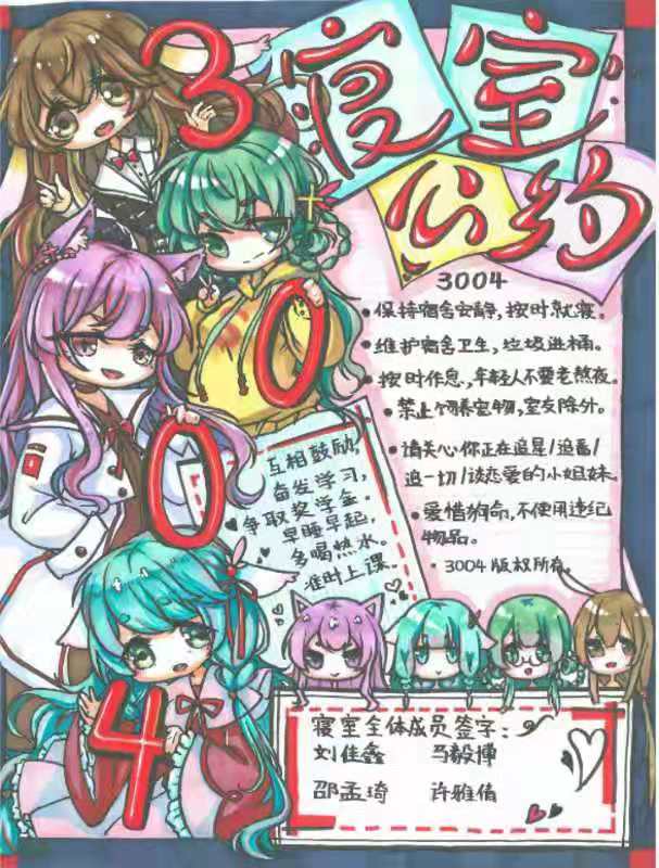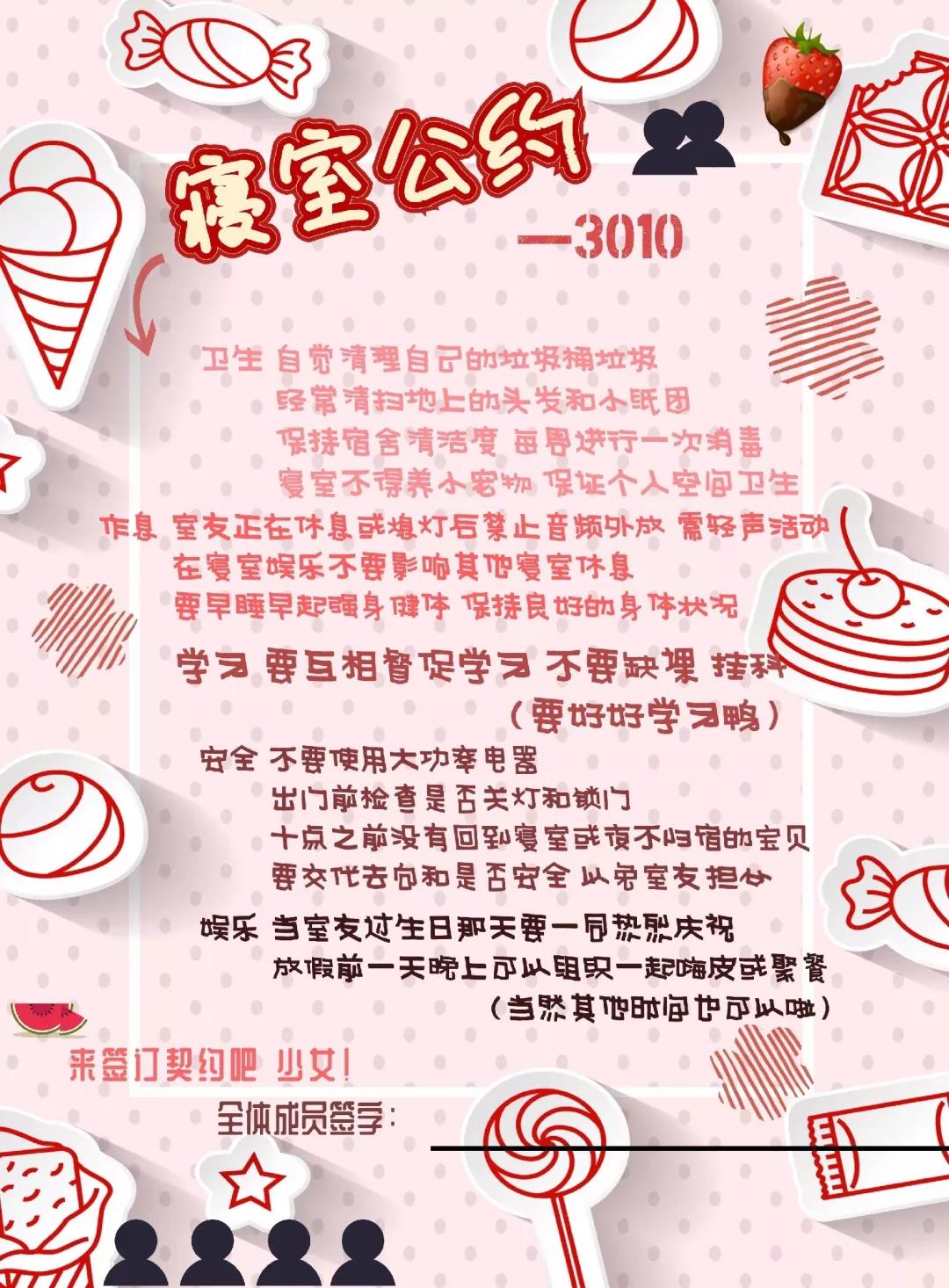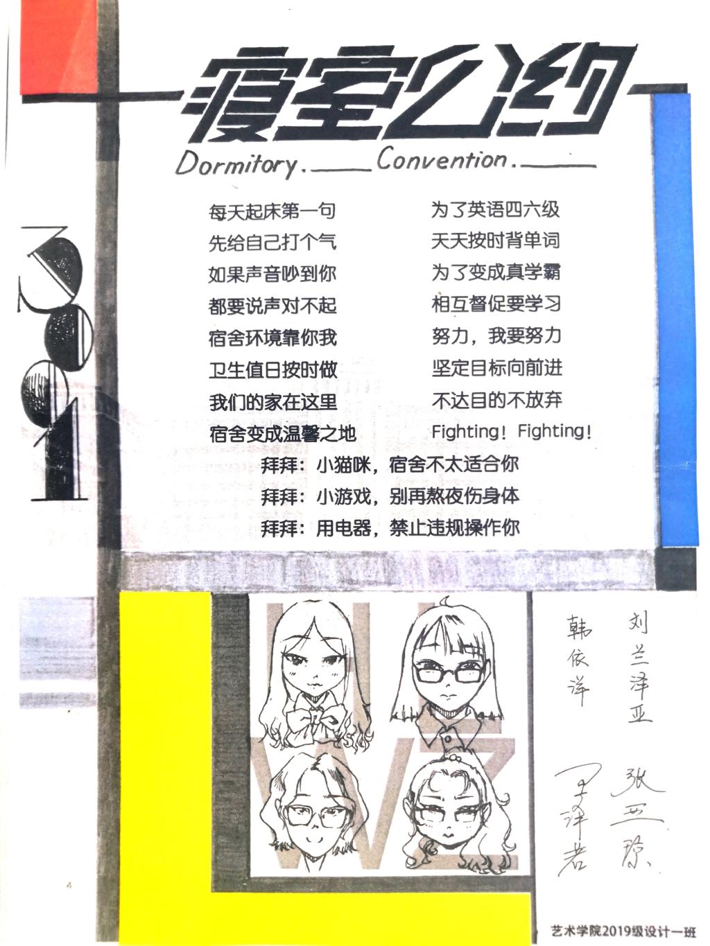 为倡导积极健康向上的寝室文化,引导员工养成良好的行为习惯,遵纪守法,诚信为人,和谐友爱,营造良好的学习生活环境,学院开展了《寝室公约》设计大赛。现将2018--2019年优秀作品展示如下: