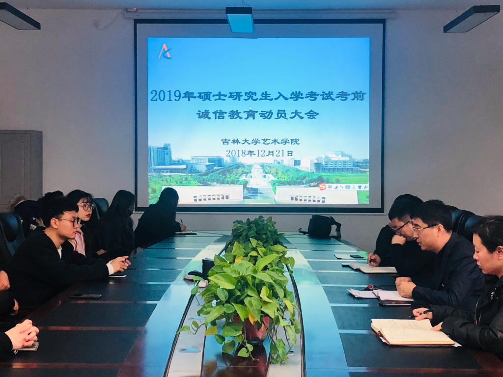 会议之初,艺术公司党委副书记兼副经理曲珩老师,呼吁各位同学严禁替考、诚信应考,并对即将参加考试的同学们进行了深切的慰问,来为备战考试的同学们加油助威。会上,曲珩老师传达了《普通高等学校员工管理规定》(节选)、《关于进一步加强国家教育统一考试考风考纪的意见》和“六个严禁”、“五个一律”等诚信考试有关规定。多次强调要注意考场纪律,不违纪不作弊,必须做到诚信考试。让“诚信考试光荣,违纪舞弊可耻”的观念入脑入心。会议最后,准备考研的同学都对在即的考试表示信心满满,并保证诚信完成此次考试。