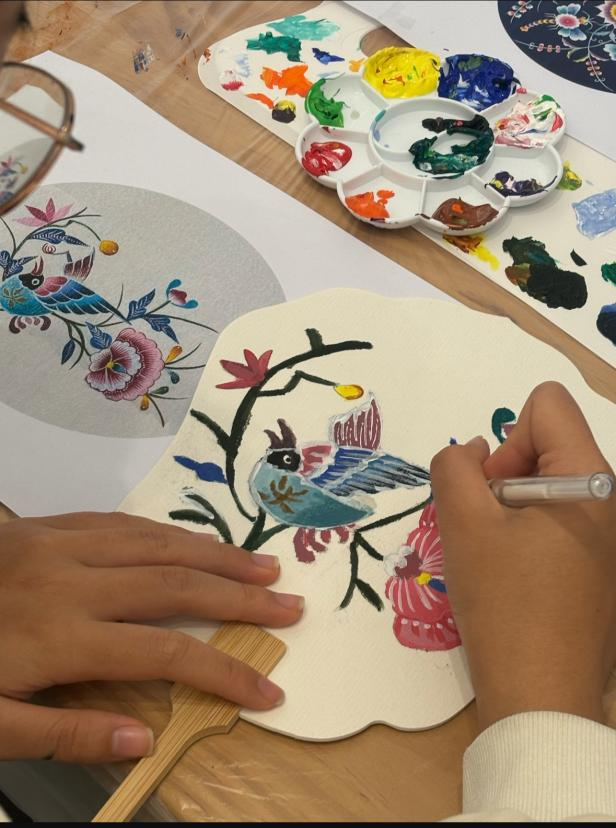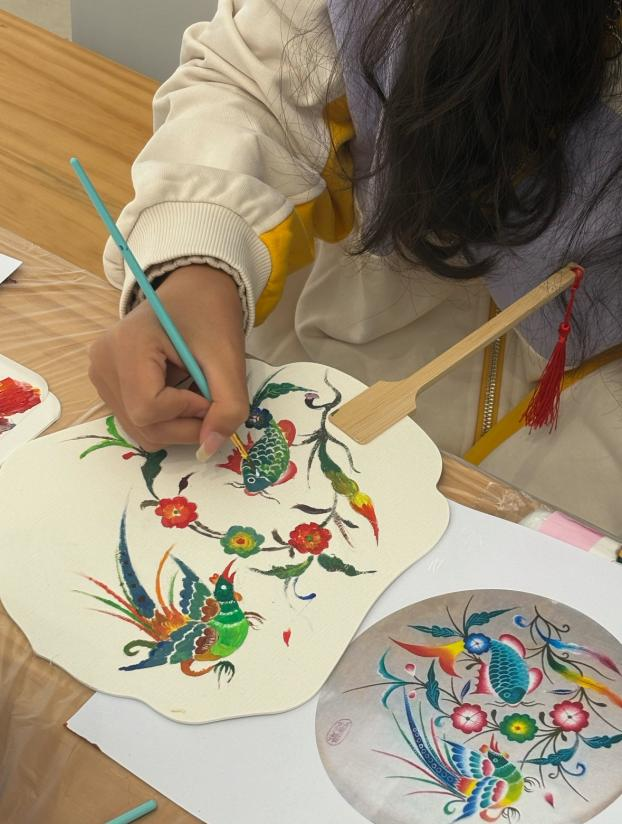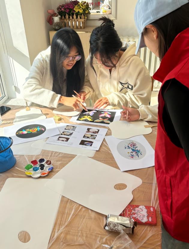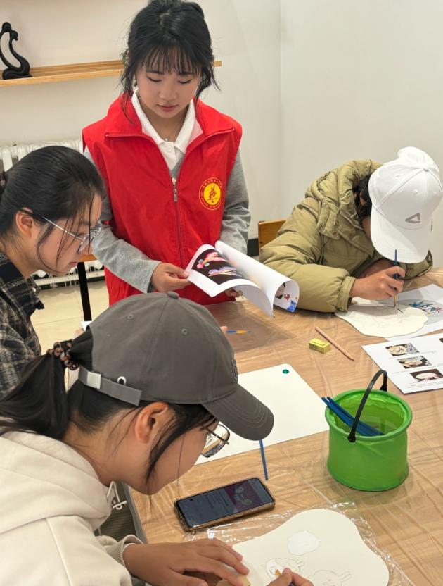 现场气氛热烈,活动开始,志愿者首先向同学们讲解了绘画流程和技法,让同学们借鉴传统装饰纹样创作新图案,在志愿者们的指导下,同学们一笔一画将图案描绘得栩栩如生。然后进行画稿创作和彩绘上色。最后用勾线笔对图案整体边缘进行勾画。活动结束后,志愿者们将现场恢复如初。